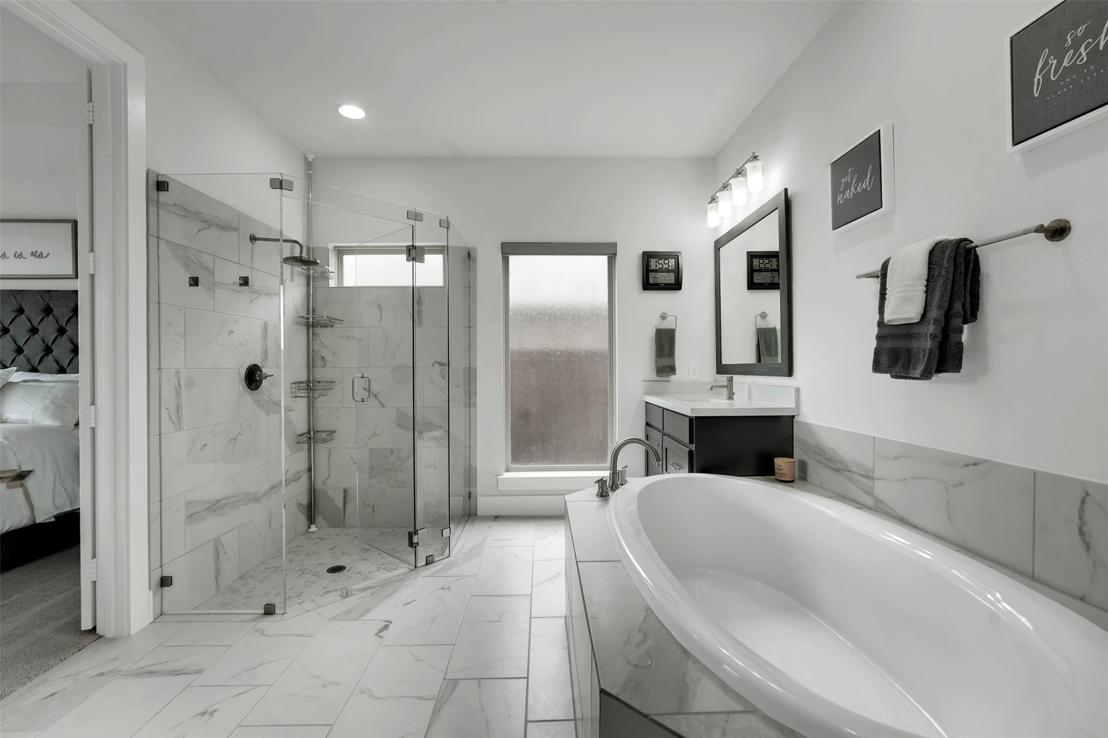 The inviting living room features a cozy fireplace, a stunning 66-inch ceiling fan, and large windows that flood the space with sunlight. The primary bedroom and bath are conveniently located on the first floor, offering a luxurious retreat with 10-foot tray ceiling, dual vanities, a garden tub, separate glass-enclosed shower, and a generous walk-in closet.